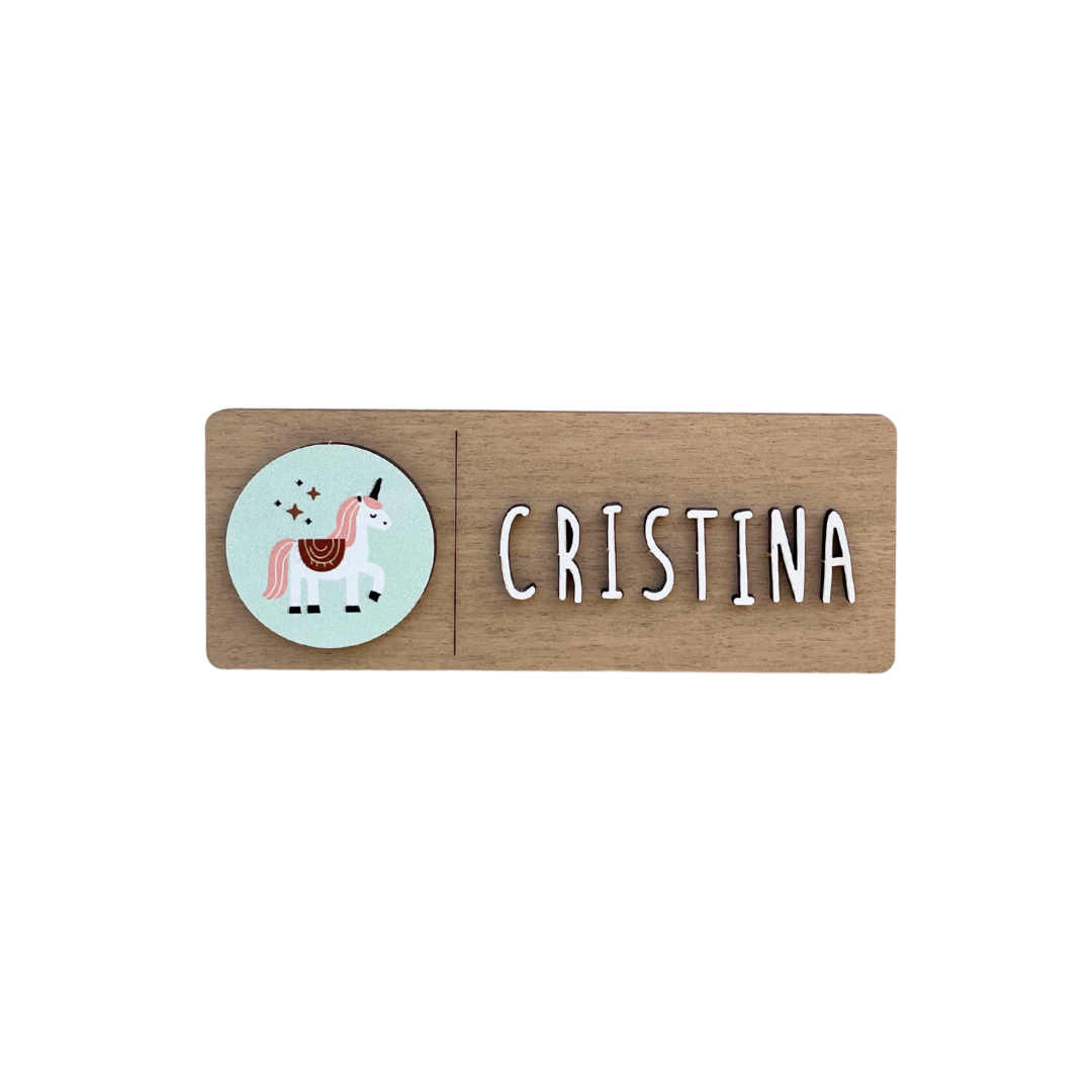 Placa decorativa de madera, de forma rectangular para personalizar con el nombre y también con el charm que tú quieras. Elige entre los 10 diseños que tenemos.