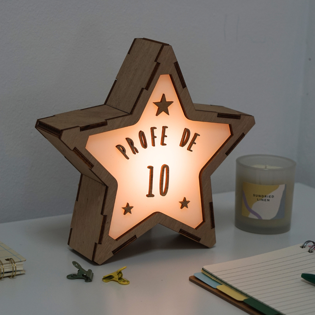 Sorprende a esa profe que lo ha dado todo con una lámpara con forma de estrella y el mensaje “Profe de 10”. Hecha en madera sostenible, esta lámpara personalizada es ideal como detalle de fin de curso. Ilumina su aula o su rincón favorito con un regalo original, emotivo y funcional. ¡Incluye kit para personalizar con nombre, frase o clase!