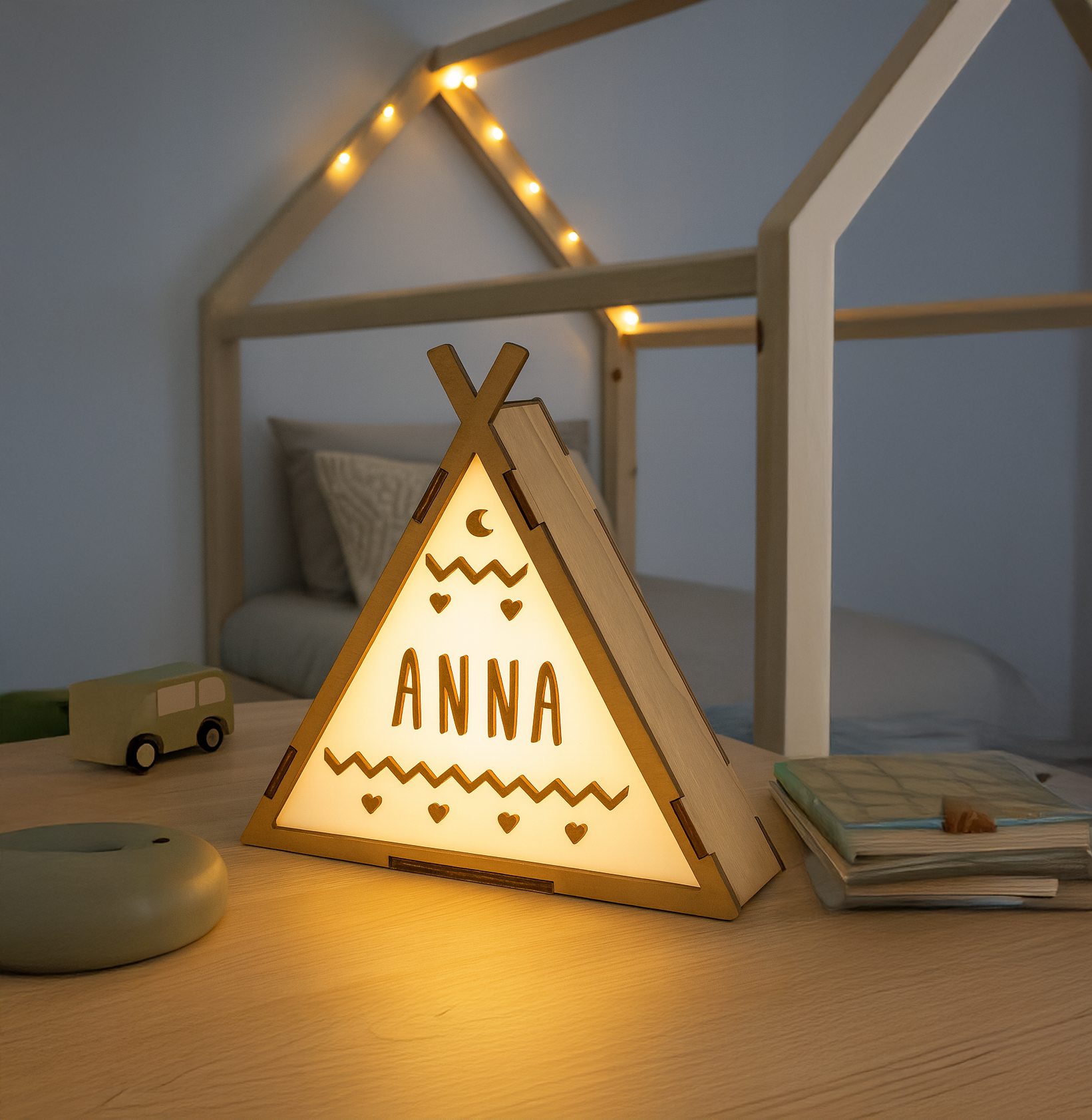 Nuestra Lámpara Tipi está diseñada en madera y cuenta con luz cálida para crear un ambiente acogedor y relajante.